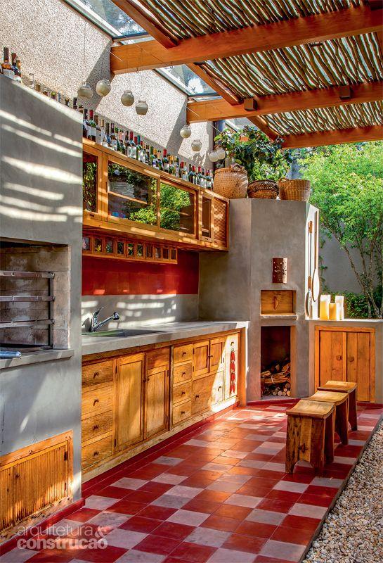 Esta churrasqueira é feita com uma estrutura de concreto na área externa com cobertura de pergolado de bambu. A madeira esta presente no projeto, tanto na parte inferior a churrasqueira como nos armários do ambiente.